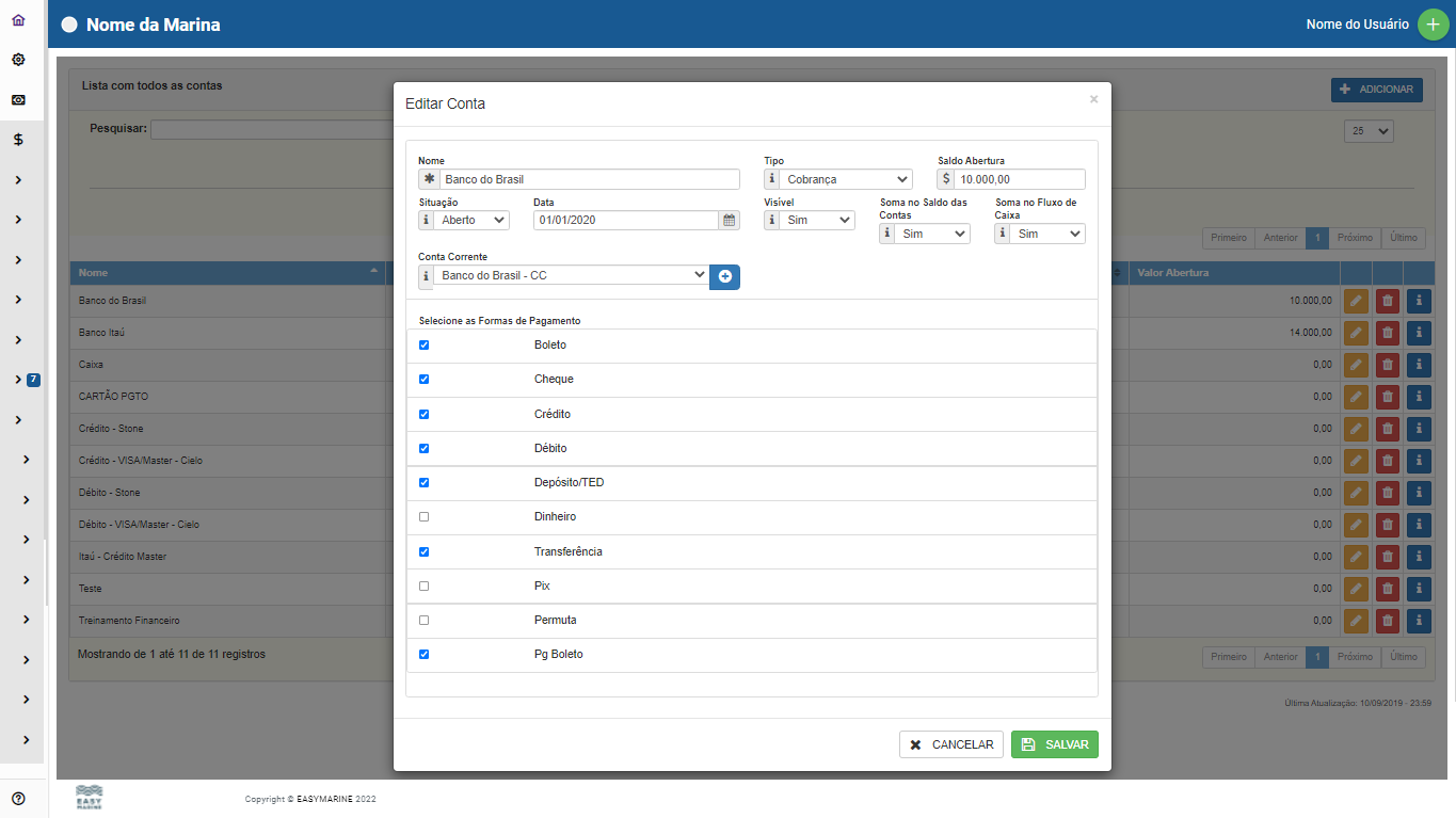 Ao criar a conta, é obrigatório selecionar as formas de pagamento.