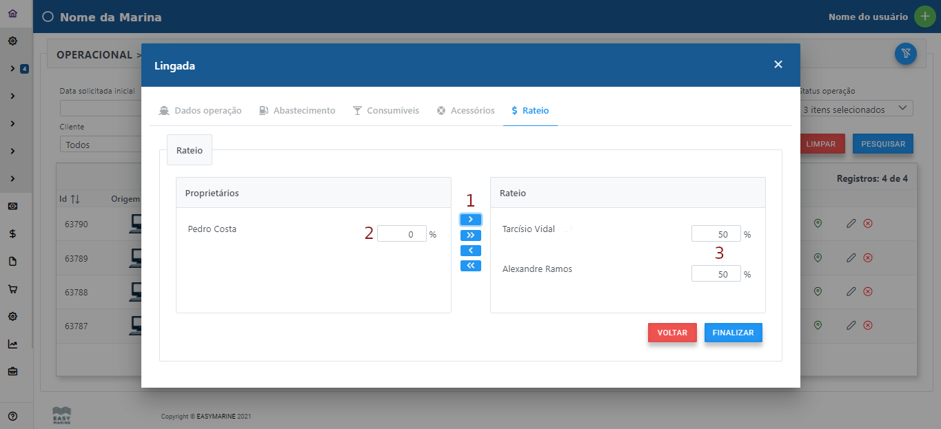3 - Proprietários ao lado direito estão no rateio e suas porcentagens podem ser definidas através destes formulários.