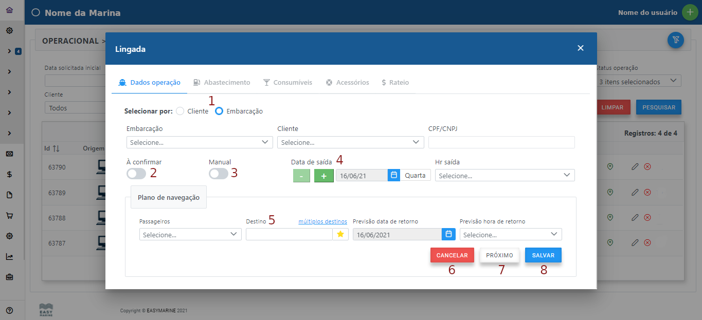 1 - Aqui é definido se a lingada será iniciada por nome de cliente ou nome da embarcação. Isso vem por definição das configurações gerais, mas é de livre escolha.
