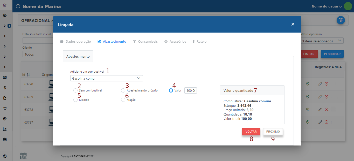 6 - Abastecimento por frações configuradas da marina. Geralmente meio tanque ou tanque cheio.