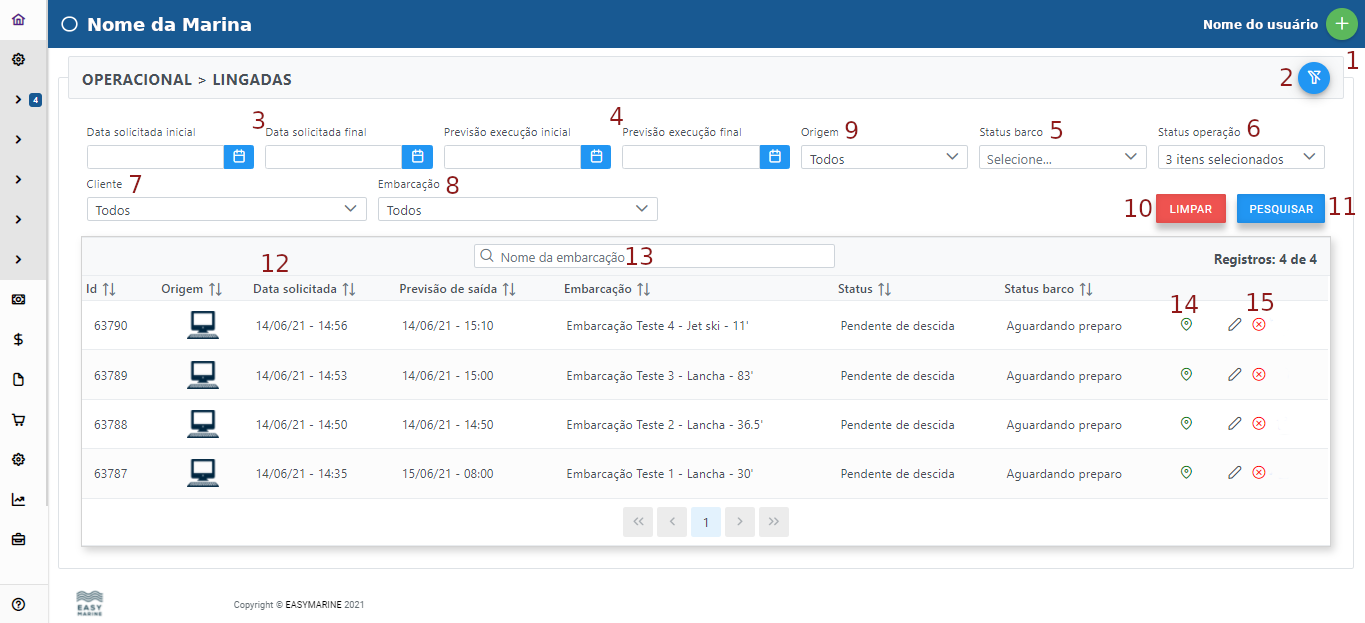 Na tela de lingadas você encontrará por padrão as navegações em andamento, no entanto, todas as lingadas estão disponíveis a depender dos filtros selecionados.