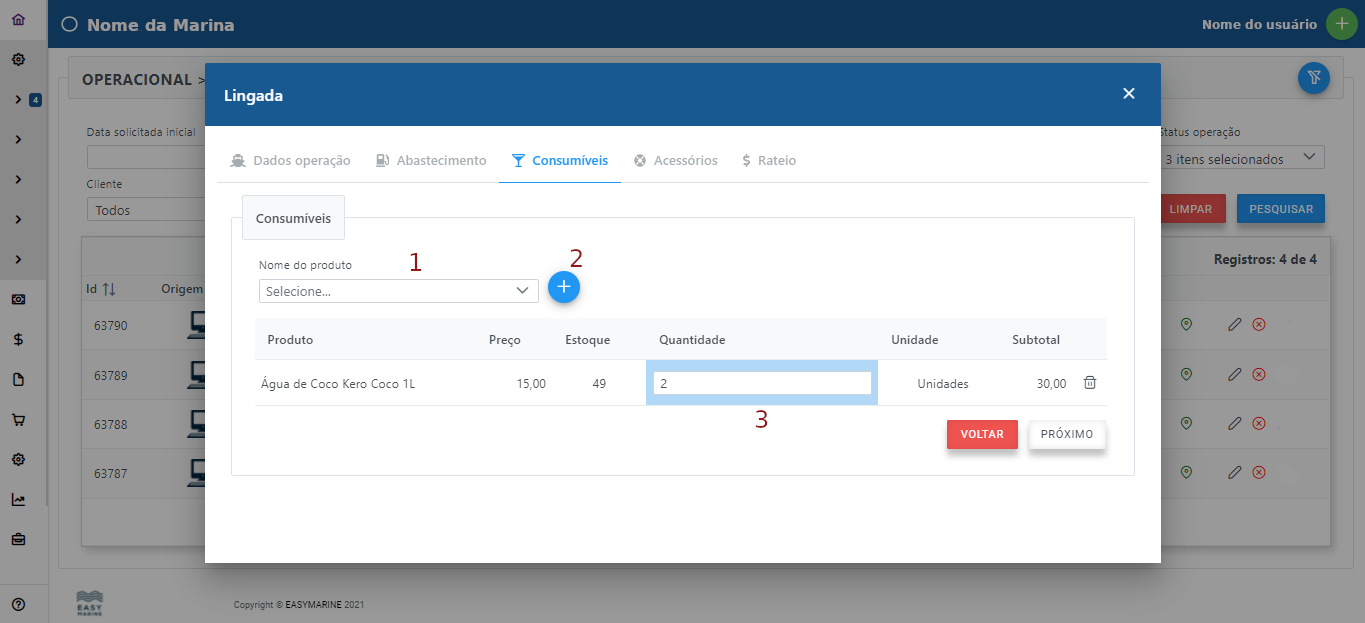 3 - Apresentado o nome do produto, seu preço e estoque, é escolhida a quantidade. Se escolher o produto errado, basta clicar na lixeira.